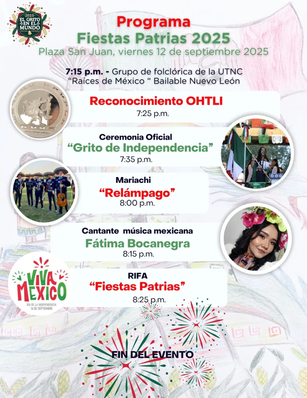 Posteriormente se llevará a cabo la ceremonia cívica, en la que la cónsul Vivian Juárez Mondragón dará el tradicional Grito de Independencia. La noche continuará con la presentación del Mariachi Relámpago, y el cierre de la celebración estará a cargo de la cantante Fátima Bocanegra, además de una entrega de premios al público asistente, poniendo el broche de oro a esta fiesta patriótica.